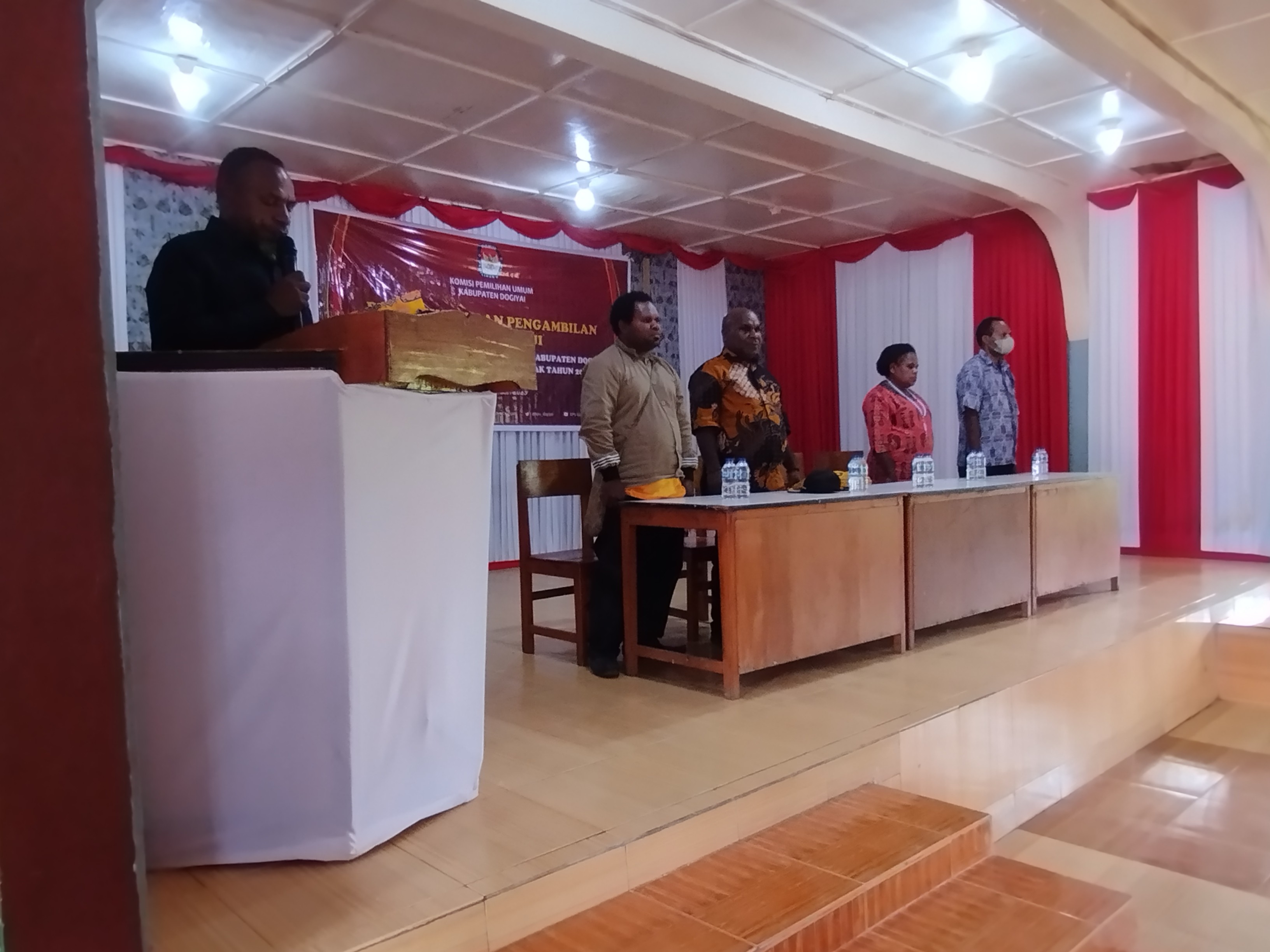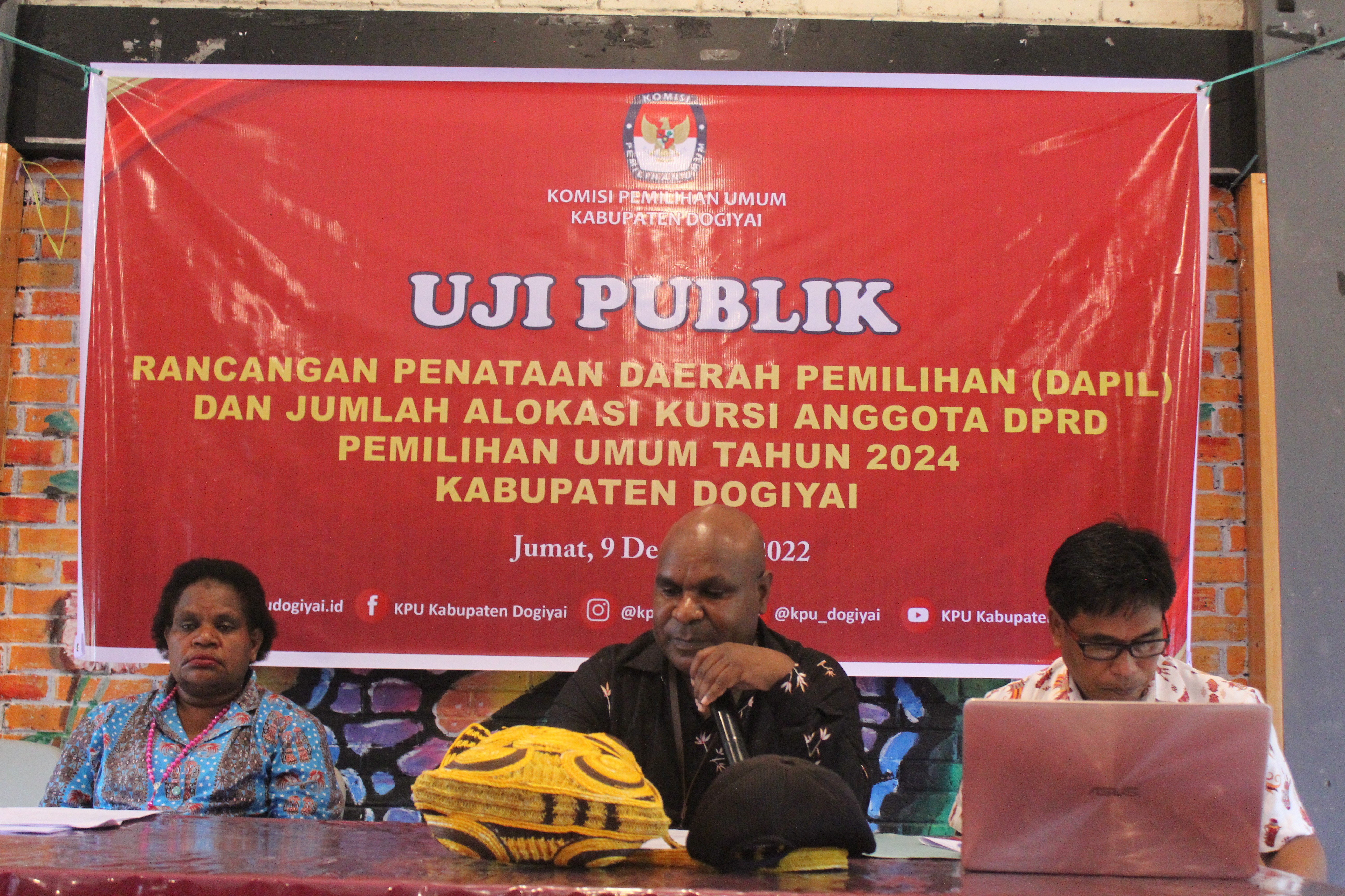 Bertempat di Rumah Makan Sari Kuring Jl. Kupang Nabire, KPU Kabupaten Dogiyai menggelar Uji Publik Rancangan Penataan Daerah Pemilihan (Dapil) dan Jumlah Alokasi Kursi Anggota DPRD Kabupaten Dogiyai untuk Pemiihan Umum Tahun 2024, Jumat (9/12/22). Dalam melaksanakan Uji Publik ini, KPU Kabupaten Dogiyai mengundang Bawaslu Kabupaten Dogiyai dan Ketua serta Sekretaris Partai Politik Se-Kabupaten Dogiyai,. Andrias Gobai selaku Anggota Komisioner Divisi Teknis Penyelenggara memimpin Rapat Uji Publik sekaligus membuka Kegiatan. Didampingi Kasubag Teknis & Hupmas Rudi Lati sebagai Moderator Rapat Uji Publik, Andrias Gobai menjadi pemateri terkait Rancangan Penataan Dapil dan Jumlah Alokasi Kursi yang telah dibuat KPU Kabupaten Dogiyai. Andrias Gobai menyampaikan beberapa hal kepada para tamu undangan yang hadir, mengenai dasar pembuatan rancangan dengan berdasarkan UU No. 7 tentang Pemilu Tahun 2017 dan mengacu pada PKPU Nomor 6 Tahun 2022 Tentang Penataan Daerah Pemilihan dan Alokasi Kursi Anggota Dewan Perwakilan Rakyat Daerah Kabupaten/Kota dalam Pemilihan Umum dan juga Juknis maupun Pedoman yang ada. ‘’Pembagian dapil dan alokasi kursi sudah menyesuiakan dengan jumlah Penduduk yang ada di Kabupaten Dogiyai yang datanya berasal dari Dirjendukcapil melalui Kemendagri pada Semester I Tahun 2022. KPU Dogiyai dalam menyusun Dapil dan Alokasi kursi DPRD telah mempedomani 7 Prinsip/Aspek yang ada dalam PKPU Nomor 6 Tahun 2022 dan itu sudah terpenuhi. dalam hal ini seperti kesetaraan nilai suara antar dapil, ketaatan pada sistem Pemilu yang proporsional, integritas wilayah, cakupan wilayah yang sama, memperhatikan sejarah, sosial, budaya, adat istiadat, dan kelompok minoritas” Ujar Andrias Gobai Andrias Gobai juga mengatakan dalam kegiatan uji publik ini diharapakan bagi KPU Kabupaten Dogiyai dapat meminta Masukan, Tanggapan dan Pertimbangan dalam rancangan yang sudah dibuat, sehingga nantinya pembagian dapil dan alokasi kursi di tiap Dapil dapat diterima baik oleh semua pihak dan juga untuk mewujudkan kualitas pemilu yang baik pula.